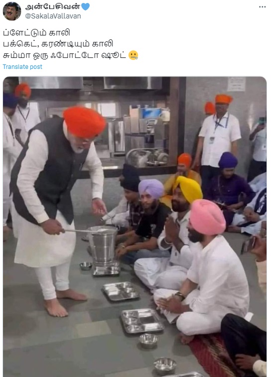 காலியான வாளியில் இருந்து உணவு பரிமாறிய பிரதமர் மோடி என்று பரவும் புகைப்படத்தகவல் உண்மையா?