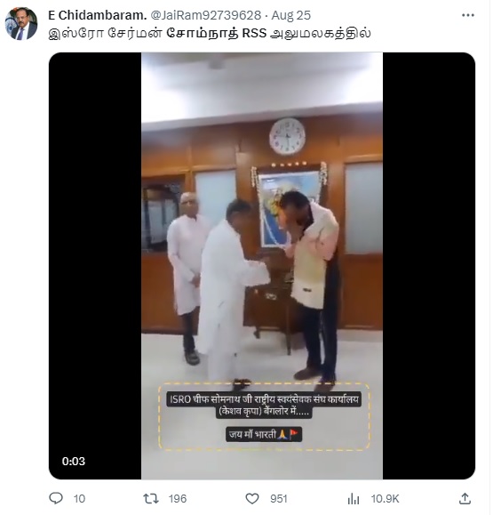 RSS அலுவலகத்தில் இஸ்ரோ தலைவர் சோம்நாத் என்று வீடியோ ஒன்று சமூக வலைத்தளங்களில் பரவி வருகிறது.