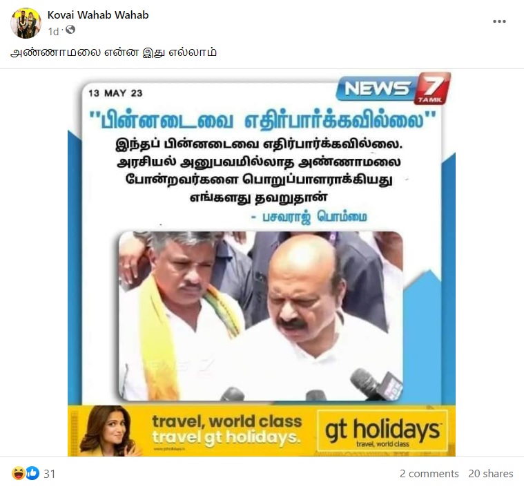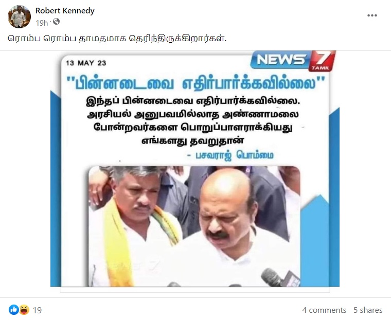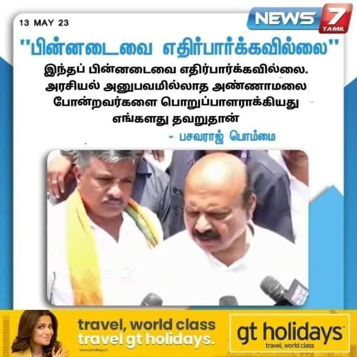 “இந்தப் பின்னடைவை எதிர்பார்க்கவில்லை. அரசியல் அனுபவமில்லாத அண்ணாமலை போன்றவர்களை பொறுப்பாளராக்கியது எங்களது தவறுதான் – பசவராஜ் பொம்மை” என்று அந்த நியூஸ்கார்ட் வைரலாகிறது.
