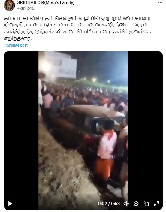 “கர்நாடகாவில் ரதம் செல்லும் வழியில் ஒரு முஸ்லீம் காரை நிறுத்தி, நான் எடுக்க மாட்டேன் என்று கூற, நீண்ட நேரம் காத்திருந்த இந்துக்கள் கடைசியில் காரை தூக்கி குறுக்கே எறிந்தனர்.” என்று இந்த வீடியோ பரவி வருகிறது.