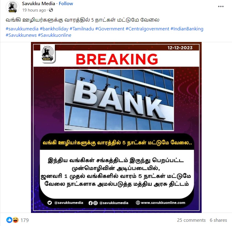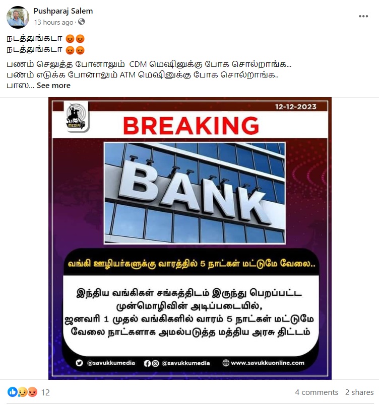 ஜனவரி 1ஆம் தேதி முதல் வங்கிகள் வாரத்தில் 5 நாட்கள் மட்டுமே செயல்பட உள்ளதாகப் பரவும் தகவல் குறித்த உண்மையறிய அதுபற்றிய ஆய்வில் ஈடுபட்டோம்.