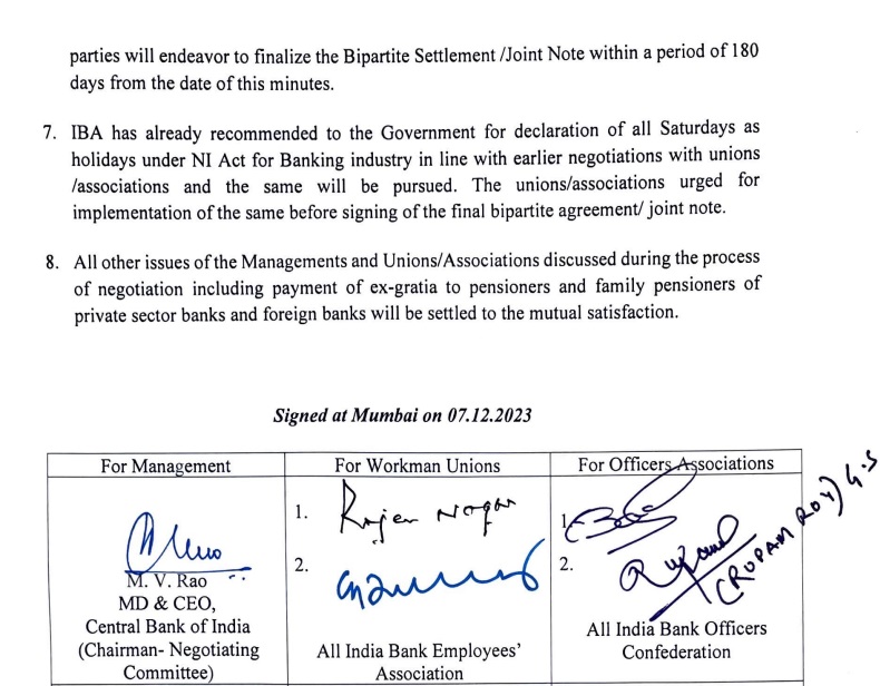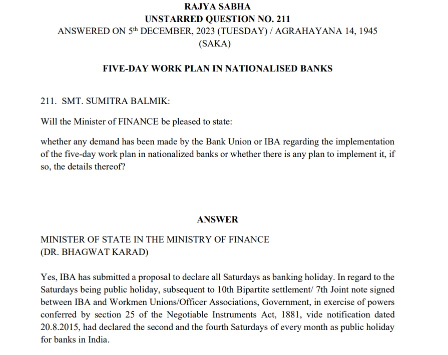 தேசியமயமாக்கப்பட்ட வங்கிகளுக்கு வாரத்தில் ஐந்து நாட்கள் மட்டுமே வேலையளிக்க வேண்டும் என்று கோரிக்கை எழுந்துள்ளதா என்பது தொடர்பாக 05 டிசம்பர் 2023 அன்று நாடாளுமன்றத்தில் எழுப்பப்பட்ட கேள்விக்கு பதிலளித்த மத்திய இணையமைச்சர் பகவத் காரத், IBA தரப்பிலிருந்து வாரத்தில் ஐந்து நாட்கள் மட்டுமே வங்கிகள் செயல்பட அனுமதிக்க வேண்டும் என்று கோரிக்கை எழுப்பப்பட்டுள்ளதாக தெரிவித்துள்ளார்.