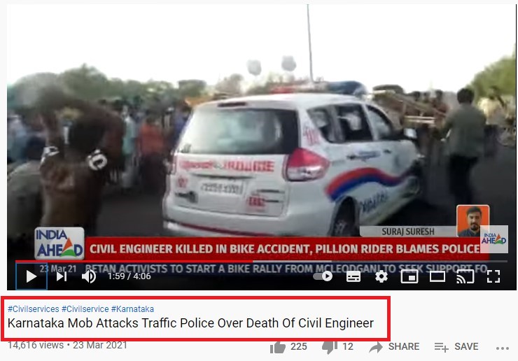 கர்நாடகாவில் முகக்கவசம் அணியாததற்கு அபராதம் விதித்ததால் போலீசாரை பொதுமக்கள் தாக்கியதாக கூறி சமூக வலைத்தளங்களில் பரப்பப்படும் வீடியோ தவறானது என்பதையும், அவ்வீடியோ போலீசாரிடமிருந்து தப்பிக்க முயன்ற பொறியாளர் ஒருவர் உயிரிழந்ததால், அதன்பின் ஏற்பட்ட கலவரத்தின்போது எடுக்கப்பட்டதென்பதையும் உரிய ஆதாரத்துடன் விளக்கியுள்ளோம்.