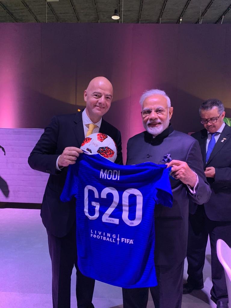 கடந்த 2018 ஆம் ஆண்டு பிரதமர் மோடி அவர்கள் ஜி-20 மாநாட்டில் கலந்துகொள்ள அர்ஜெண்டினா சென்றிருந்தார். இத்தருணத்தில் FIFA தலைவர் ஜியானி பிரதமர் மோடியை சந்தித்து மோடி ஜி-20 என்றே எழுதப்பட்ட டி-சர்ட் ஒன்றை பரிசாக அளித்தார்.