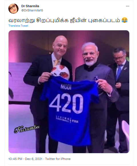 இந்தியப் பிரதமர் நரேந்திர மோடி அவர்களுக்கு FIFA தலைவர் ஜியானி இன்ஃபான்டினோ டி-சர்ட் ஒன்றை பரிசாக அளிப்பதாக புகைப்படம் ஒன்று வைரலாகி வருகின்றது. ஜியானி வழங்கிய அந்த டி-சர்ட்டில் மோடி 420 என்று எழுதப்பட்டிருந்தது.