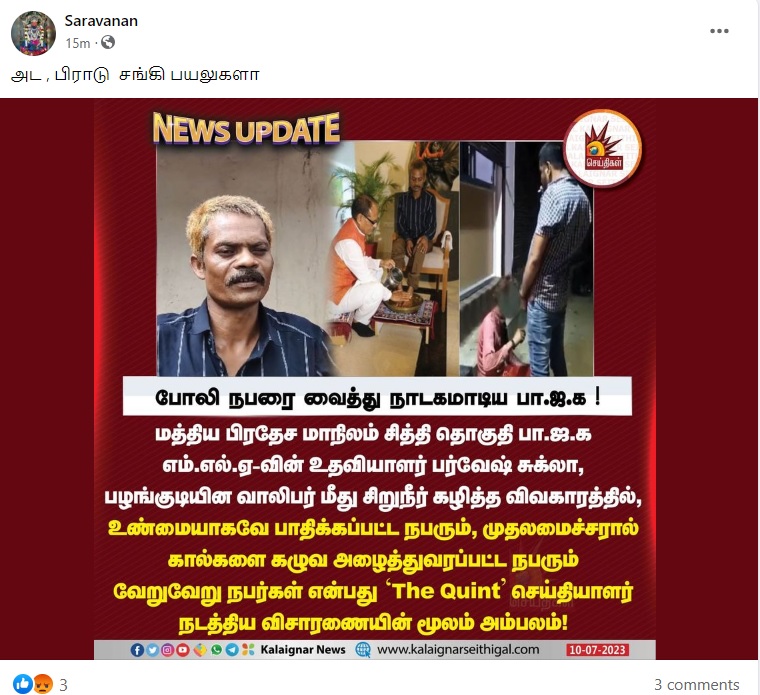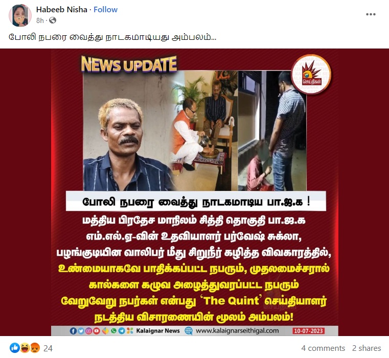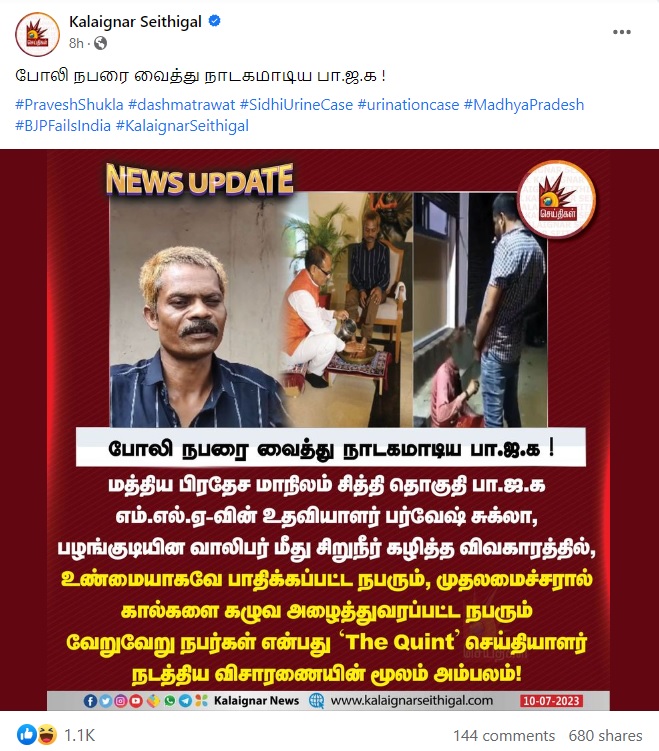 ”மத்திய பிரதேச மாநிலம் சித்தி தொகுதி பா.ஜ.க எம்.எல்.ஏ-வின் உதவியாளர் பர்வேஷ் சுக்லா, உண்மையாகவே பாதிக்கப்பட்ட நபரும், முதலமைச்சரால் கால்களை கழுவ அழைத்துவரப்பட்ட நபரும் வேறுவேறு நபர்கள் என்பது ‘The Quint’ செய்தியாளர் நடத்திய விசாரணையின் மூலம் அம்பலம்!” என்று கலைஞர் செய்திகள் உட்பட பல ஊடகங்கள் செய்தி வெளியிட்டுள்ளன.