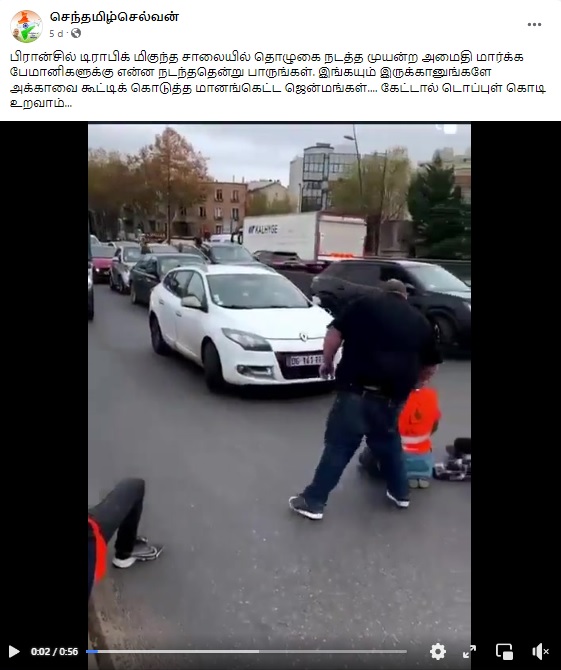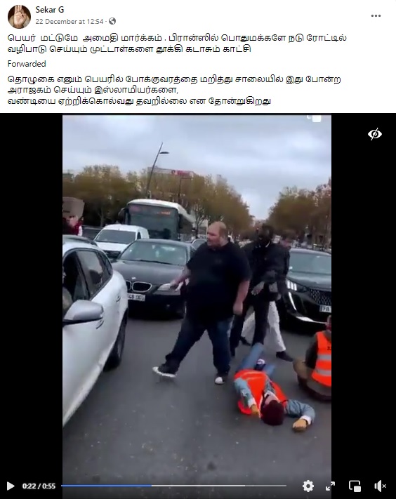 பிரான்ஸில் சாலையில் தொழுகை செய்த இஸ்லாமியர்கள் வலுக்கட்டாயமாக அகற்றப்பட்டனர் என்று வீடியோ தகவல் சமூக வலைத்தளங்களில் பரவியதைத் தொடர்ந்து இதுகுறித்து ஆய்வு செய்தோம்.