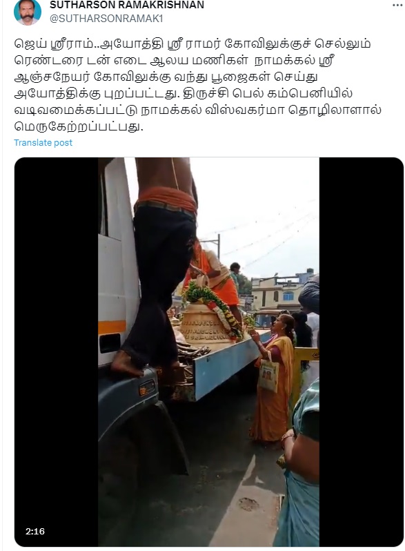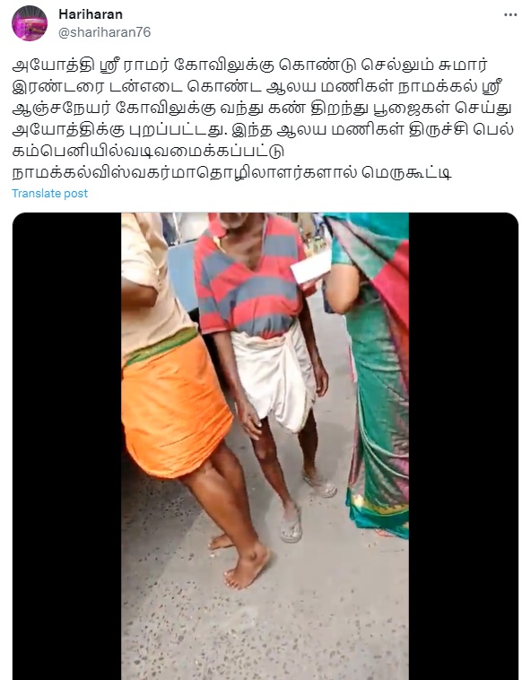 “ஜெய் ஶ்ரீராம்..அயோத்தி ஸ்ரீ ராமர் கோவிலுக்குச் செல்லும் ரெண்டரை டன் எடை ஆலய மணிகள் நாமக்கல் ஶ்ரீ ஆஞ்சநேயர் கோவிலுக்கு வந்து பூஜைகள் செய்து அயோத்திக்கு புறப்பட்டது. திருச்சி பெல் கம்பெனியில் வடிவமைக்கப்பட்டு நாமக்கல் விஸ்வகர்மா தொழிலாளால் மெருகேற்றப்பட்டது.” என்று இந்த வீடியோ பரவுகிறது.