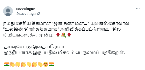 இந்திய தேசிய கீதமான ‘ஜன கண மண..’ உலகின் சிறந்த தேசிய கீதமாக UNESCO – வால் அறிவிக்கப்பட்டதாக சமூக வலைத்தளங்களில் பரவும் தகவல் முற்றிலும் தவறானது என்பது நமக்கு கிடைத்த ஆதாரங்களின் வாயிலாக தெளிவாகியுள்ளது.