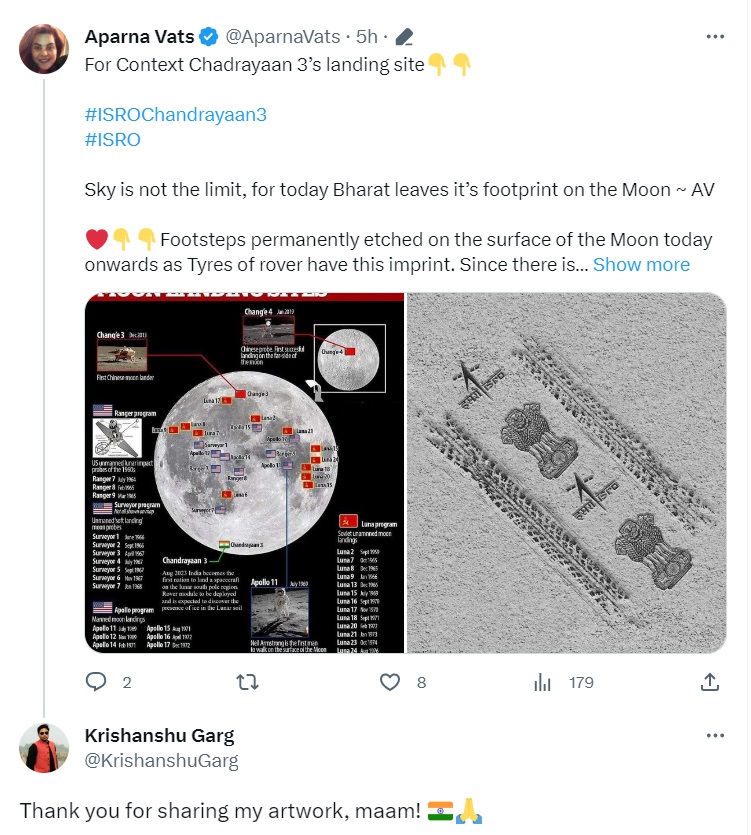 “சந்திரயான் – 3 குறித்து அனைவரும் மகிழ்ச்சியாக உள்ளனர். சந்திரனில் கால்பதிக்கும் இந்தியாவின் வெற்றியைக் கொண்டாடும் வகையிலேயே நானும் இந்த வரைகலை ஓவியத்தை உருவாக்கியுள்ளேன். எந்தவித போலிச்செய்தியையும் பரப்பும் நோக்கம் எனக்கு இல்லை; ஆனால், இதனை எவ்வாறு பிரக்யான் ரோவர் பதித்த அச்சு என்று பரப்பி வருகின்றனர் என்று புரியவில்லை. நான் போட்டோஷாப் மூலமாக இதனை உருவாக்கியுள்ளேன்” என்று விளக்கமளித்தார்.