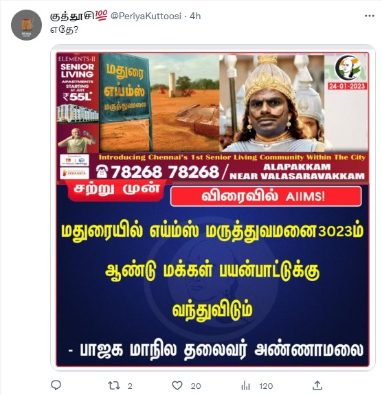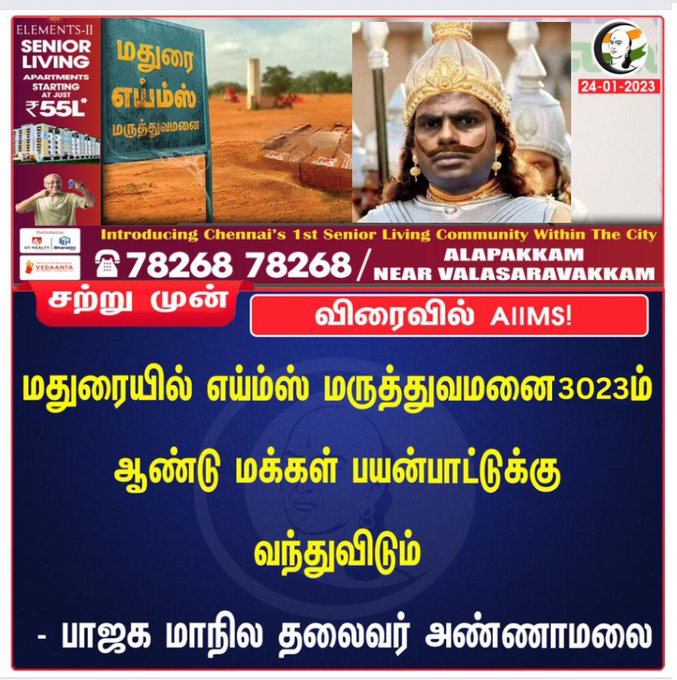 மதுரையில் எய்ம்ஸ் மருத்துவமனை 3023 ஆம் ஆண்டு பயன்பாட்டுக்கு வரும் என்று அண்ணாமலை கூறியதாகப் பரவுகின்ற நியூஸ்கார்ட் போலியானது என்பது நமக்கு கிடைத்த ஆதாரங்களின் வாயிலாக தெளிவாகியுள்ளது.