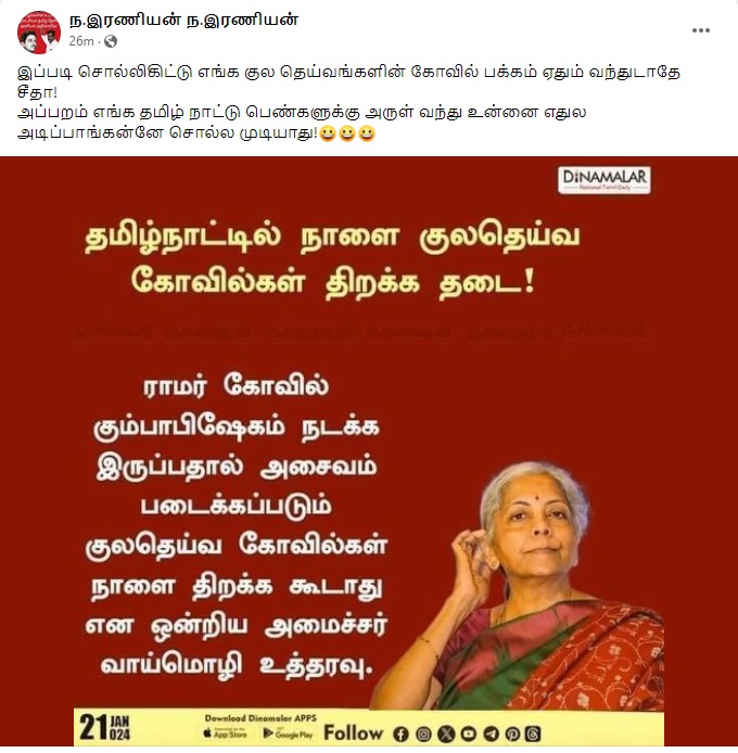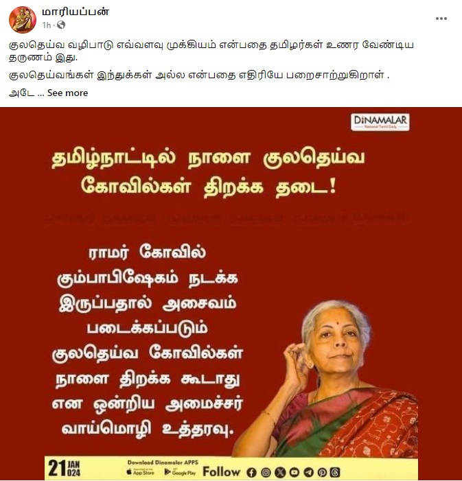 Claim: தமிழ்நாட்டில் ராமர் கோயில் குடமுழுக்கு தினத்தன்று அசைவம் படைக்கும் குலதெய்வ கோயில்களை திறக்கத் தடை – மத்திய நிதியமைச்சர் நிர்மலா சீதாராமன்