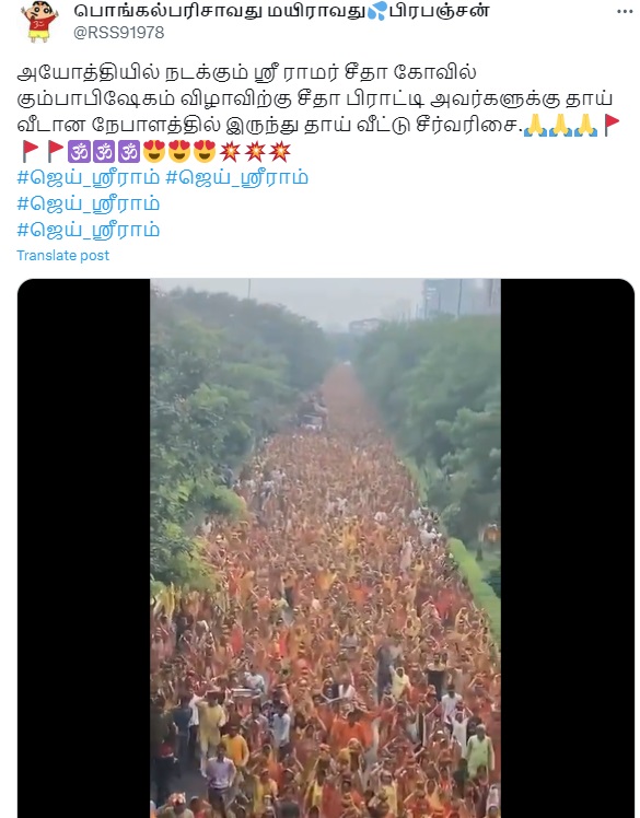 ”அயோத்தியில் நடக்கும் ஸ்ரீ ராமர் சீதா கோவில் கும்பாபிஷேகம் விழாவிற்கு சீதா பிராட்டி அவர்களுக்கு தாய் வீடான நேபாளத்தில் அதாவது பீகார் பார்டர் ஜனக்புரி பூரிதாமில் இருந்து தாய் வீட்டு சீர்வரிசை. ஜெய் ஶ்ரீ ராம்” என்று இந்த வீடியோ பரவி வருகிறது.