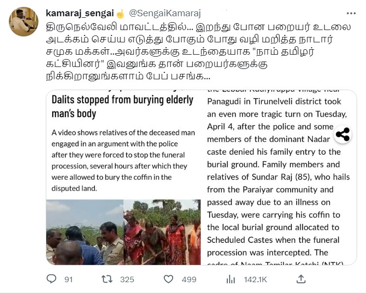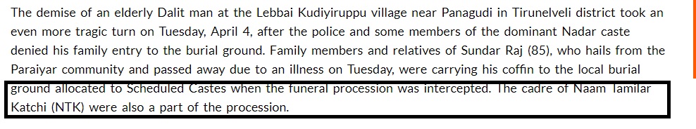 நெல்லையில் பட்டியலின சமூகத்தவரின் உடலைப் புதைக்க மற்றொரு குறிப்பிட்ட சமுதாயத்தினர் தடுத்த சம்பவம் குறித்த செய்தியை இங்கே மற்றும் இங்கே படியுங்கள்.