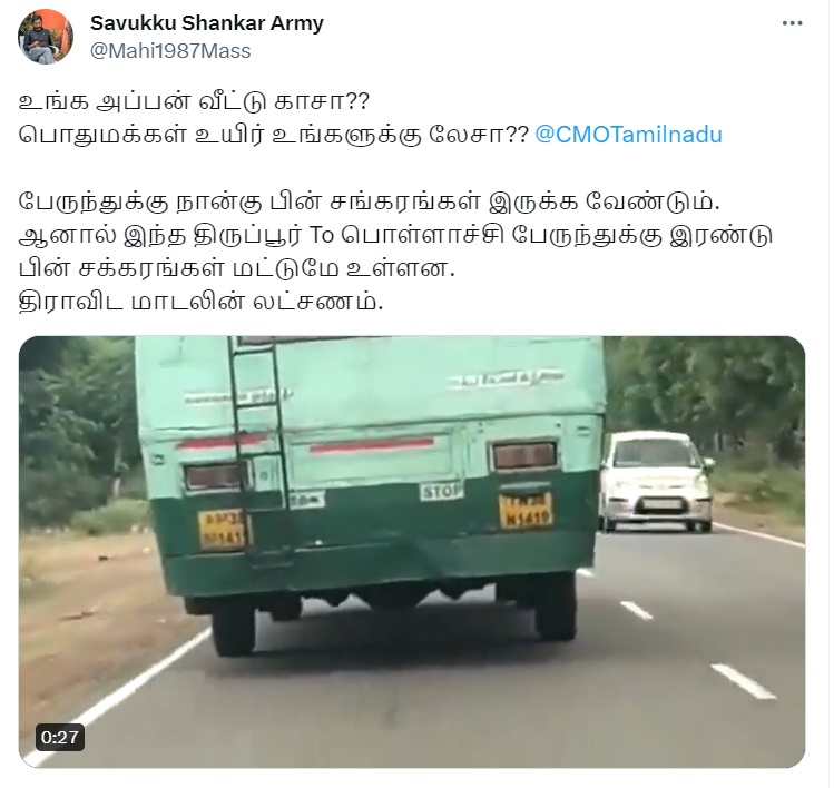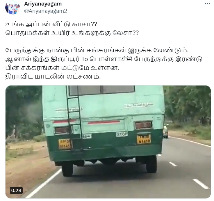 “உங்க அப்பன் வீட்டு காசா??பொதுமக்கள் உயிர் உங்களுக்கு லேசா?? @CMOTamilnadu பேருந்துக்கு நான்கு பின் சங்கரங்கள் இருக்க வேண்டும். ஆனால் இந்த திருப்பூர் To பொள்ளாச்சி பேருந்துக்கு இரண்டு பின் சக்கரங்கள் மட்டுமே உள்ளன. திராவிட மாடலின் லட்சணம்.” என்று இந்த வீடியோ பரவி வருகிறது.