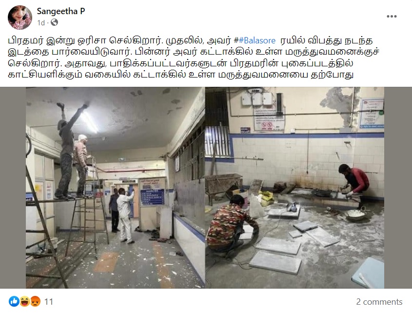 “பிரதமர் இன்று ஒரிசா செல்கிறார். முதலில், அவர் Balasore ரயில் விபத்து நடந்த இடத்தை பார்வையிடுவார். பின்னர் அவர் கட்டாக்கில் உள்ள மருத்துவமனைக்குச் செல்கிறார். அதாவது, பாதிக்கப்பட்டவர்களுடன் பிரதமரின் புகைப்படத்தில் காட்சியளிக்கும் வகையில் கட்டாக்கில் உள்ள மருத்துவமனையை தற்போது தயார் ஆகிறது … உயிரைவிட விளம்பரம் முக்கியம் குமாரு” என்ற பதிவுடன் புகைப்படம் ஒன்று பகிரப்பட்டு வருகிறது.