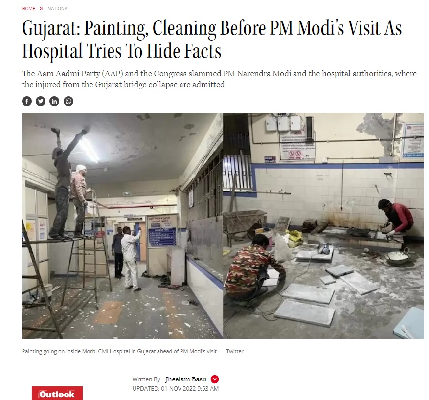 குஜராத் மாநிலம் மோர்பியில் பாலம் இடிந்து விழுந்த விபத்தில் 100க்கும் மேற்பட்டோர் பலியாகினர். இந்நிலையில், விபத்தில் சிகிச்சை பெற்று வருபவர்களை பார்வையிட வருகின்ற பிரதமர் மோடிக்காக மோர்பி சிவில் மருத்துவமனைக்கு புதிய வெள்ளைப்பூச்சு உட்பட வேலைகள் நடைபெறுவதாக சர்ச்சை எழுந்தது.