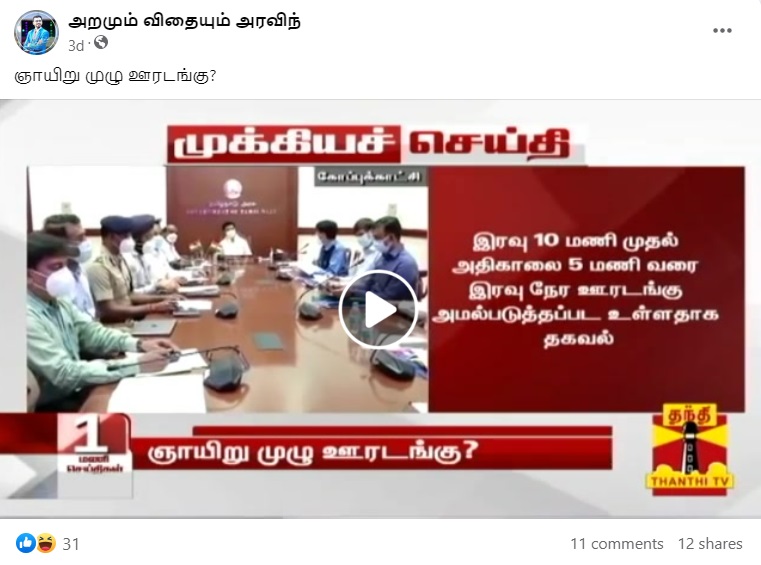 கொரோனா பரவலால் தமிழகத்தில் ஞாயிற்றுக்கிழமைகளில் முழு ஊரடங்கு அறிவிக்கவிருப்பதாக தகவல் என்று செய்தி வீடியோ ஒன்று சமூக வலைத்தளங்களில் பரவி வருகிறது.