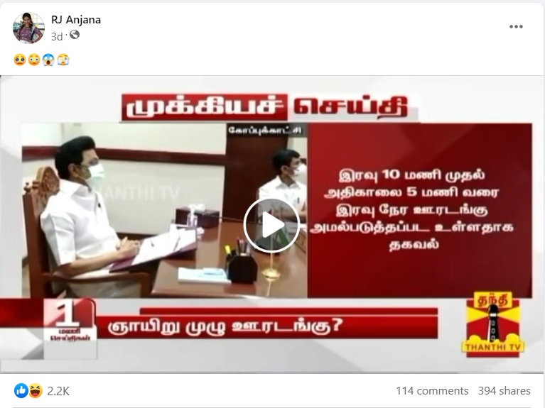 “தமிழகத்தில் முழு ஊரடங்கு” என்கிற தகவலுடன் செய்தி அந்த வீடியோ சமூக வலைத்தளங்களில் வைரலாகிறது.