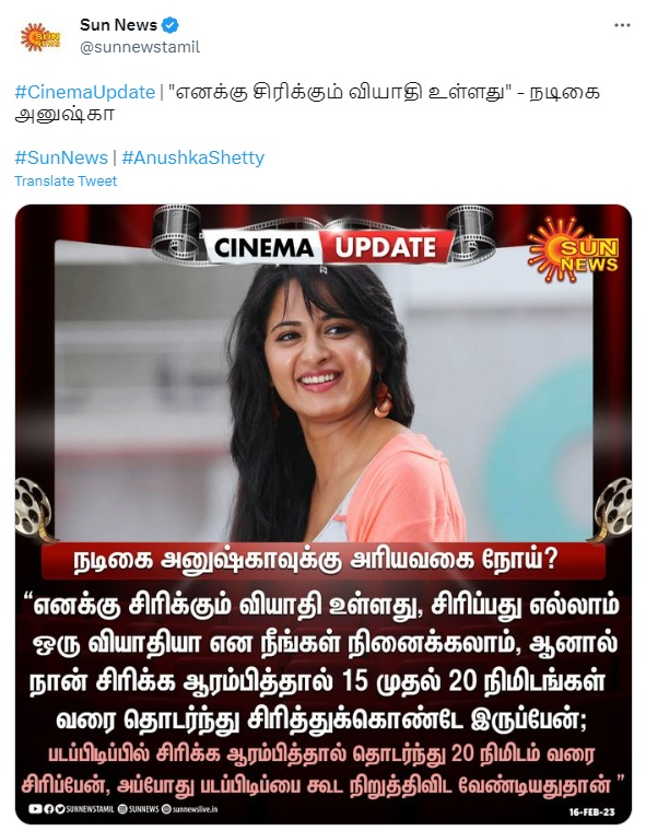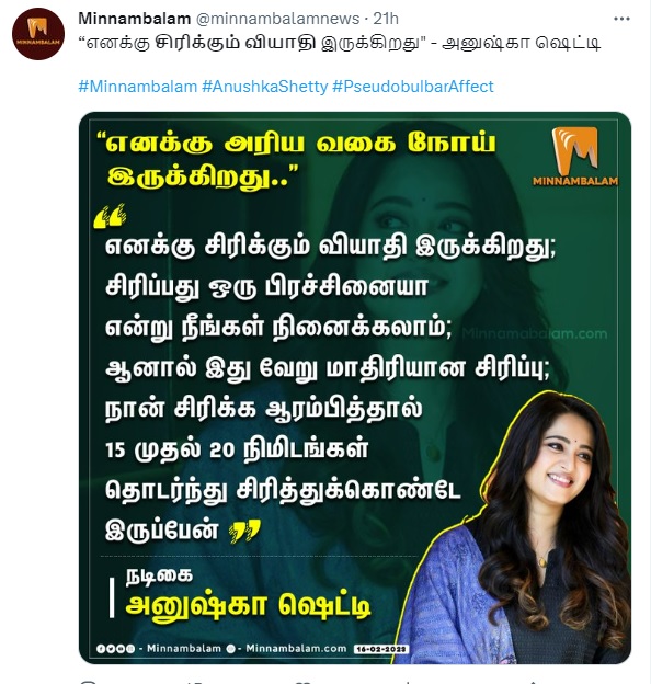 நடிகை அனுஷ்காவிற்கு சிரிக்கும் வியாதி இருப்பதாக பரவும் தகவல் குறித்த உண்மையறிய அதுகுறித்த ஆய்வில் ஈடுபட்டோம்.