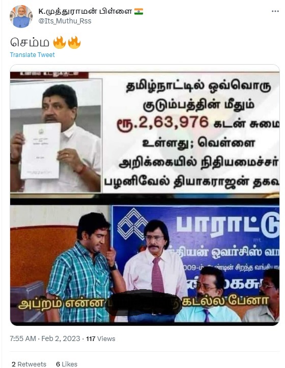 ”தமிழ்நாட்டில் ஒவ்வொரு குடும்பத்தின் மீதும் ரூ.2,63,967 கடன் சுமை உள்ளது; வெள்ளை அறிக்கையில் நிதியமைச்சர் பழனிவேல் தியாகராஜன் தகவல். அப்புறம் எதுக்கு கடல்ல பேனா?” என்பதாக புகைப்படத்தகவல் பரவி வருகிறது.