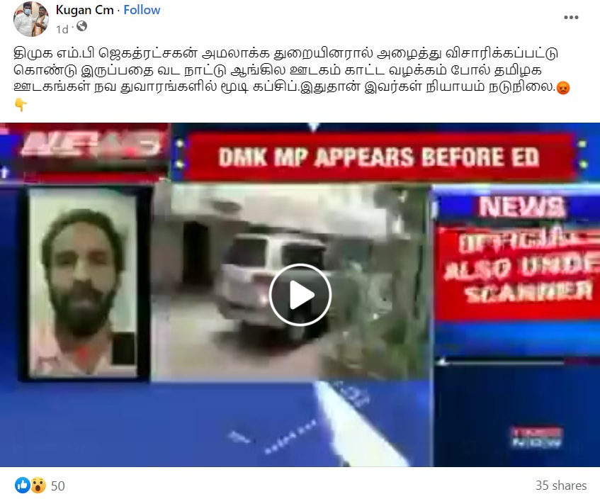 திமுக எம்பி ஜெகத்ரட்சகனிடம் அமலாக்கத்துறை விசாரணை;மூடிமறைக்கும் தமிழ்நாடு ஊடகங்கள் என்று செய்தி வீடியோ ஒன்று சமூக வலைத்தளங்களில் வைரலாகிறது.