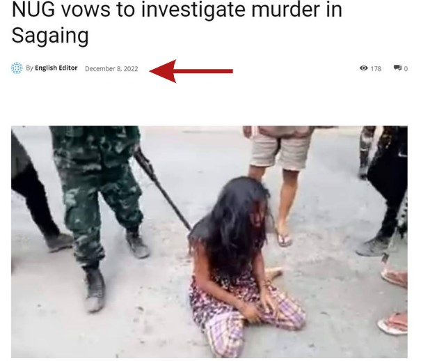 தொடர்ந்து, நம் தேடலில் Myanmar Now கடந்த டிசம்பர் 06, 2022 அன்று வெளியிட்டிருந்த செய்திக்கட்டுரை ஒன்று நமக்குக் கிடைத்தது. அதில் குறிப்பிட்ட வீடியோவின் ஸ்க்ரீன் ஷாட், “ “Myanmar’s publicly mandated National Unity Government (NUG) has been carrying out a probe into the execution of a civilian by members of a resistance force under its command near Sagaing Region’s border with India. A video emerged on social media over the weekend in which around a dozen armed men and women are seen beating a woman before shooting her dead in the middle of a road.” என்கிற செய்தியுடன் இடம்பெற்றிருந்தது. இந்த கட்டுரையின்படி பாதிக்கப்பட்ட அப்பெண்மணியின் பெயர் Aye mar Tun என்று குறிப்பிடப்பட்டிருந்தது.