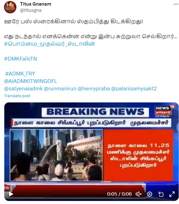 தமிழக முதல்வர் மு.க.ஸ்டாலின் சிங்கப்பூர் சுற்றுலா செல்வதாக செய்தி வீடியோ ஒன்று சமூக வலைத்தளங்களில் பரவி வருகிறது.