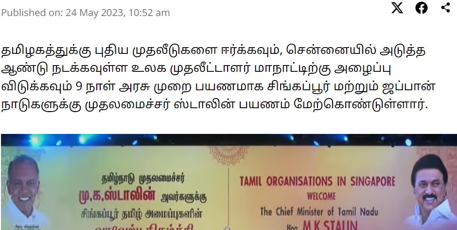 தமிழக முதல்வர் மு.க.ஸ்டாலின் சிங்கப்பூர் சுற்றுலா செல்வதாக பரவும் வீடியோ செய்தி குறித்த உண்மையறிய அதுபற்றிய ஆய்வில் ஈடுபட்டோம்.