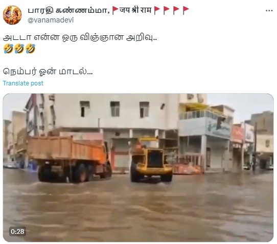 சென்னையில் தேங்கிய மழைநீர் புல்டோசர் மூலமாக அகற்றப்படுவதாகப் பரவும் வீடியோ தகவல் குறித்த உண்மையறிய அதுபற்றிய ஆய்வில் ஈடுபட்டோம்.