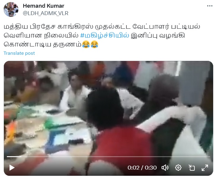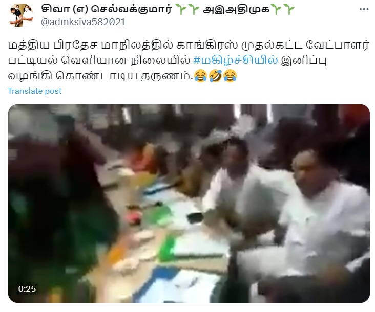 ”மத்திய பிரதேச காங்கிரஸ் முதல்கட்ட வேட்பாளர் பட்டியல் வெளியான நிலையில் மகிழ்ச்சியில் இனிப்பு வழங்கி கொண்டாடிய தருணம்” என்று இந்த வீடியோ வைரலாகிறது.
