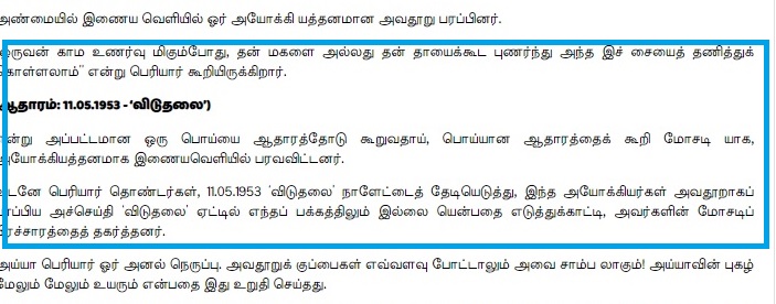மேலும், “தாக்கத் தாக்கத் தழைப்பவர் பெரியார்” என்கிற தலைப்பில் விடுதலை நாளிதழில் வெளியாகிய கட்டுரை ஒன்றில் போலியாக இந்த அவதூறு கருத்து பெரியார் கூறியதாகப் பரப்பப்பட்டு வருகிறது என்கிற விளக்கம் இடம்பெற்றிருக்கிறது.