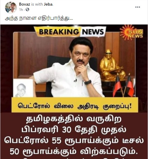 இந்நிலையில், “பெட்ரோல் விலை அதிரடி குறைப்பு. தமிழகத்தில் இன்று நள்ளிரவு முதல் பெட்ரோல் விலை 65 மட்டுமே. தமிழக அரசின் வரி 35 ஐ குறைத்து முதல்வர் மு.க.ஸ்டாலின் அதிரடி” என்கிற நியூஸ் கார்டு ஒன்று சமூக வலைத்தளங்களில் வைரலாகிறது. அதனைத் தொடர்ந்து பெட்ரோல் விலை குறித்த மற்றொரு கார்டும் வைரலாகிறது.