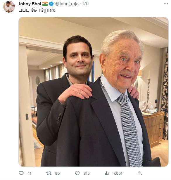 ”பப்பு சோரோஸ்” என்கிற தலைப்புடன் இப்புகைப்படம் பரவி வருகிறது. Johny Bhai என்கிற ட்விட்டர் பயனாளர் இப்புகைப்படத்தை ஷேர் செய்துள்ளார். அதனை பலரும் பகிர்ந்து வருகின்றனர்.