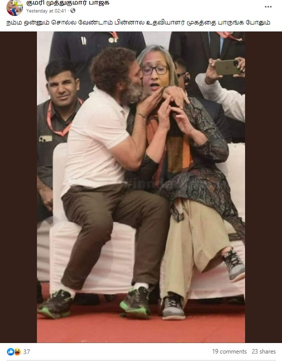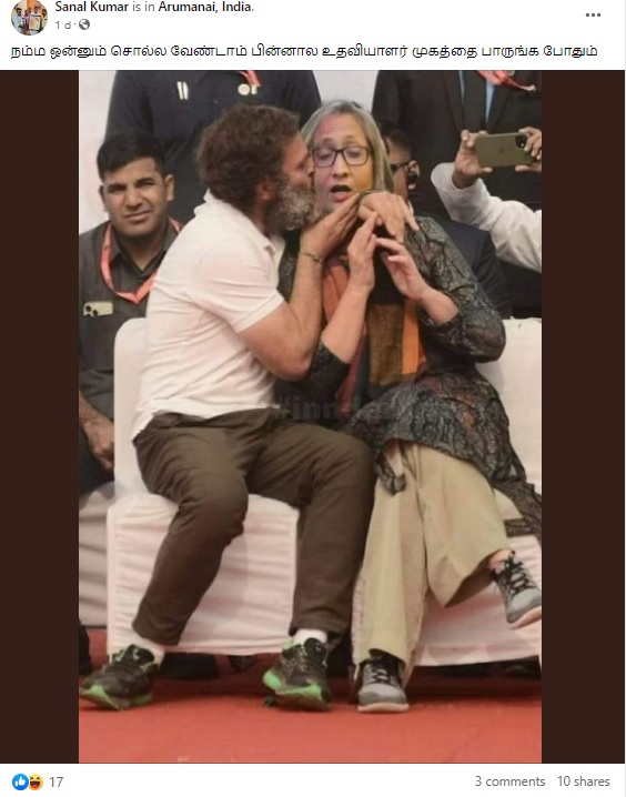 ராகுல் காந்தி பெண்மணி ஒருவரை முத்தமிடுவதாக புகைப்படம் ஒன்று சமூக வலைத்தளங்களில் வைரலாகிறது.
