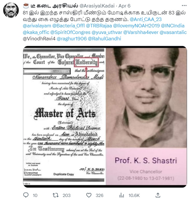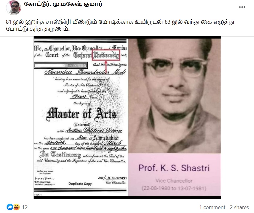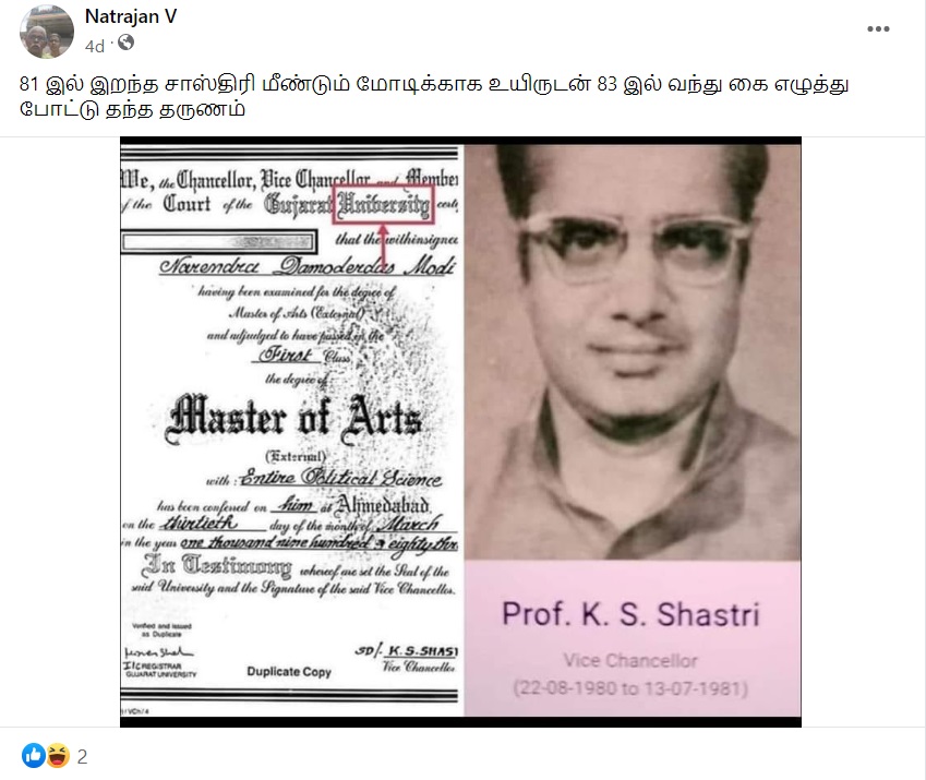 இதன்மூலம், 1981ல் குஜராத் பல்கலைக்கழகத்தில் துணைவேந்தராக பணியாற்ற ஆரம்பித்த கே.எஸ்.சாஸ்திரி அங்கு 1987 வரையில் பணியாற்றியுள்ளார் என்பதும், 1983ஆம் ஆண்டு, பிரதமர் மோடியின் டிகிரி அளிக்கப்பட்ட ஆண்டிலும் அவர் அங்கே பணியாற்றியுள்ளார் என்பதும் உறுதியாகிறது. அவர் 1981ல் இறந்துவிட்டார் என்பதும் தவறானது. இந்த கட்டுரையை Newschecker ஆங்கில இணையதளத்திலும் வெளியிட்டுள்ளோம்.