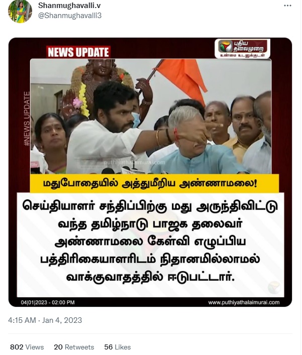 மதுபோதையில் அத்துமீறிய அண்ணாமலை என்பதாக நியூஸ்கார்ட் சமூக வலைத்தளத்தில் பரவிய நிலையில் இதுகுறித்து ஆய்வு செய்தோம்.