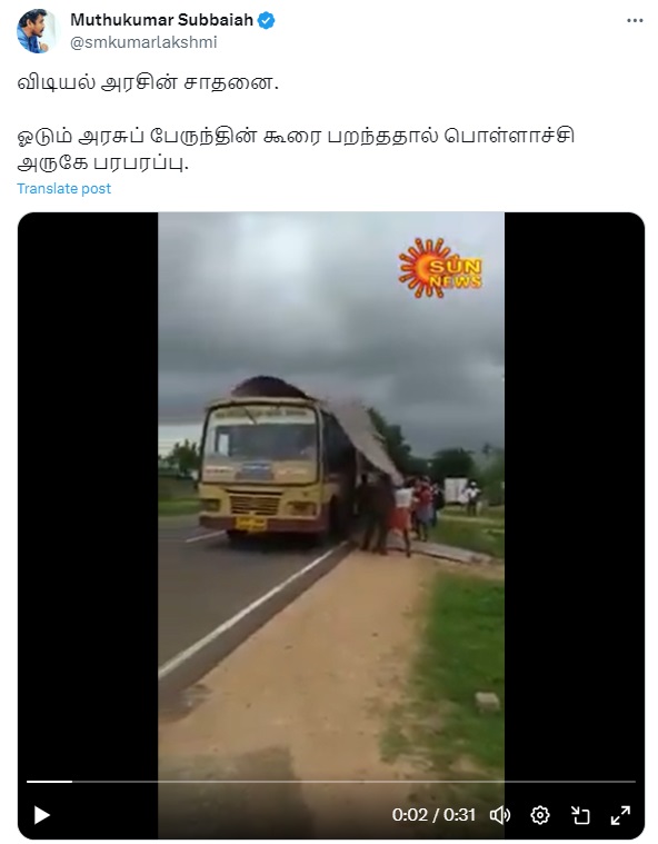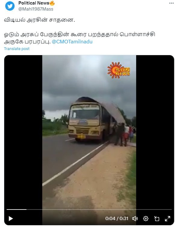 “விடியல் அரசின் சாதனை. ஓடும் அரசுப் பேருந்தின் கூரை பறந்ததால் பொள்ளாச்சி அருகே பரபரப்பு.” என்று இந்த வீடியோ பரவி வருகிறது.