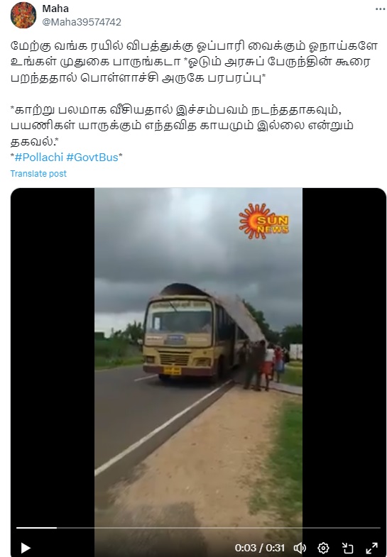பொள்ளாச்சியில் காற்றில் பறந்த அரசு பேருந்து மேற்கூரை என்று வீடியோ ஒன்று சமூக வலைத்தளங்களில் பரவி வருகிறது.