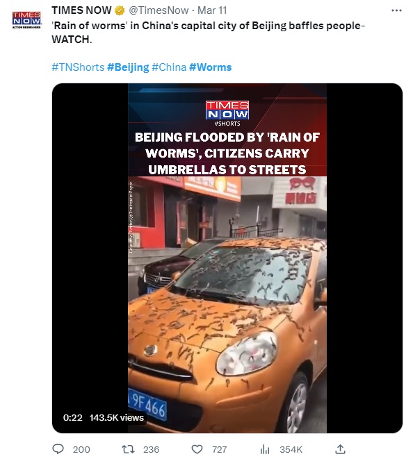 ”சீனாவில் பெய்த புழு மழை; அதிர்ச்சியில் மக்கள்!” என்பதாகப் பலரும் சமூக வலைத்தளங்களில் இந்த வீடியோவை பகிர்ந்து வருகின்றனர். டைம்ஸ் நவ் உள்ளிட்ட செய்தி ஊடகங்களும் இதைப்பகிர்ந்துள்ளன.