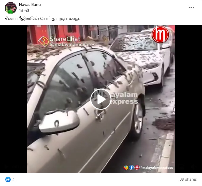 சீனாவில் புழு மழை பெய்ததாகப் பரவிய வீடியோ தகவல் குறித்த உண்மையறிய அதுகுறித்த ஆய்வில் ஈடுபட்டோம்.