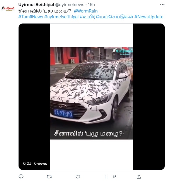சீனாவில் புழு மழை பெய்ததாகப் பரவிய வீடியோ தகவல் தவறானது என்பது நமக்கு கிடைத்த ஆதாரங்களின் வாயிலாக தெளிவாகியுள்ளது.