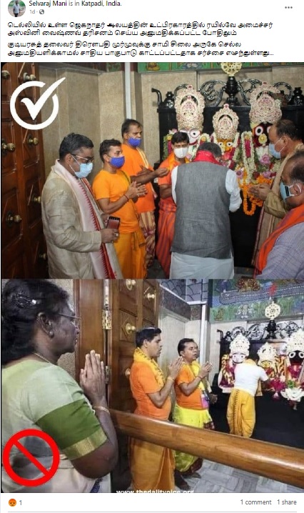 ”டெல்லியில் உள்ள ஜெகன்நாதர் ஆலயத்தின் உட்பிரகாரத்தில் ரயில்வே அமைச்சர் அஸ்வினி வைஷ்ணவ் தரிசனம் செய்ய அனுமதிக்கப்பட்ட போதிலும் குடியரசுத் தலைவர் திரௌபதி முர்முவுக்கு சாமி சிலை அருகே செல்ல அனுமதியளிக்காமல் சாதிய பாகுபாடு காட்டப்பட்டதாக சர்ச்சை எழுந்துள்ளது” என்று இந்த செய்தி பரவுகிறது.