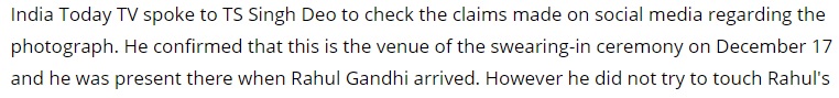 மேலும், இதுகுறித்து ஆய்வு நடத்திய போது குறிப்பிட்ட புகைப்படத்தில் ராகுல் காந்தியின் காலில் விழ முயற்சிப்பது போன்று இருப்பவர் காங்கிரஸ் கட்சியைச் சேர்ந்த டி.எஸ்.சிங் டேவ்.