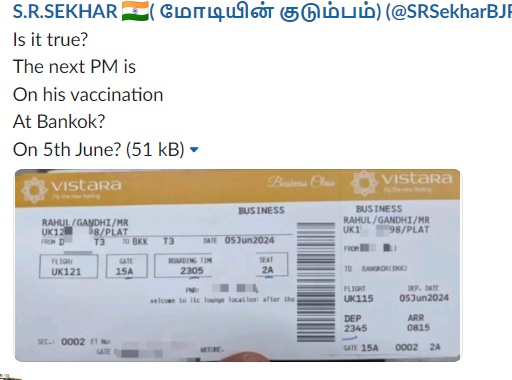 தேர்தல் முடிவுகள் அறிவிக்கப்பட்டவுடன் ராகுல் காந்தி பாங்காங்கிற்கு செல்ல இருப்பதாக போர்டிங் பாஸ் புகைப்படம் ஒன்று சமூக வலைத்தளங்களில் பரவி வருகிறது.