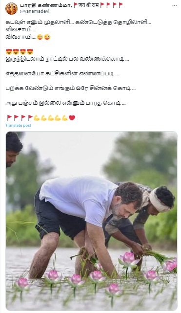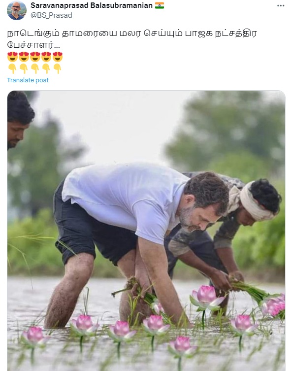 ராகுல் காந்தி வயலில் தாமரைப்பூக்களை நடுவதாகப் புகைப்படம் ஒன்று சமூக வலைத்தளங்களில் வைரலாகிறது.