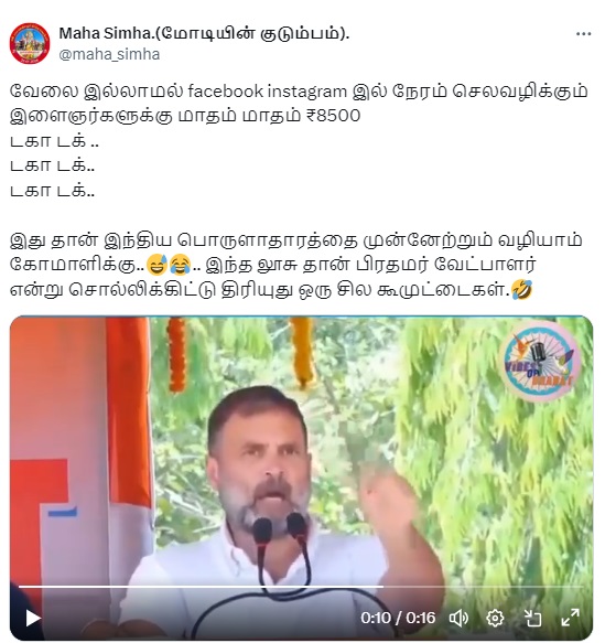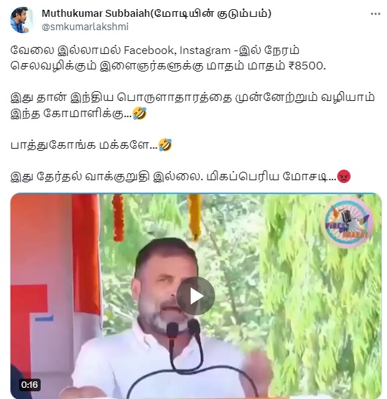 “வேலை இல்லாமல் facebook instagram இல் நேரம் செலவழிக்கும் இளைஞர்களுக்கு மாதம் மாதம் ₹8500. இது தான் இந்திய பொருளாதாரத்தை முன்னேற்றும் வழியாம் கோமாளிக்கு.. பாத்துகோங்க மக்களே” என்று இந்த வீடியோ பரவி வருகிறது.