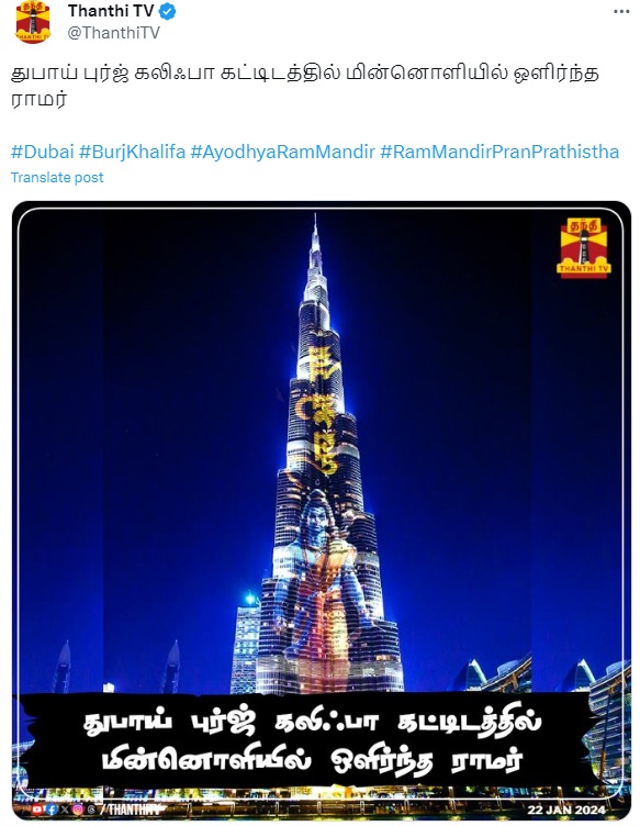 புர்ஜ் கலீஃபாவில் ஒளிரும் ராமர் உருவம் என்று தந்தி டிவி புகைப்படம் ஒன்றை நியூஸ்கார்டாக பகிர்ந்திருந்தது. அயோத்தி ராமர் கோயில் குடமுழுக்கை முன்னிட்டு இந்த நிகழ்வு நடைபெற்றதாக பகிர்ந்திருந்தது. ஆனால், தற்போது தந்தி டிவி தனது பதிவை நீக்கி விட்டது. எனினும், பாஜகவினர் உள்ளிட்ட பலரும் இப்புகைப்படத்தை சமூக வலைத்தளத்தில் பகிர்ந்து வருகின்றனர்.