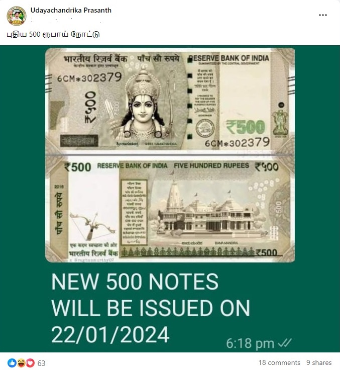 ராமர் படம் இடம்பெறும் புதிய 500 ரூபாய் நோட்டை வெளியிடும் ரிசர்வ் வங்கி என்னும் தகவல் உண்மையா?