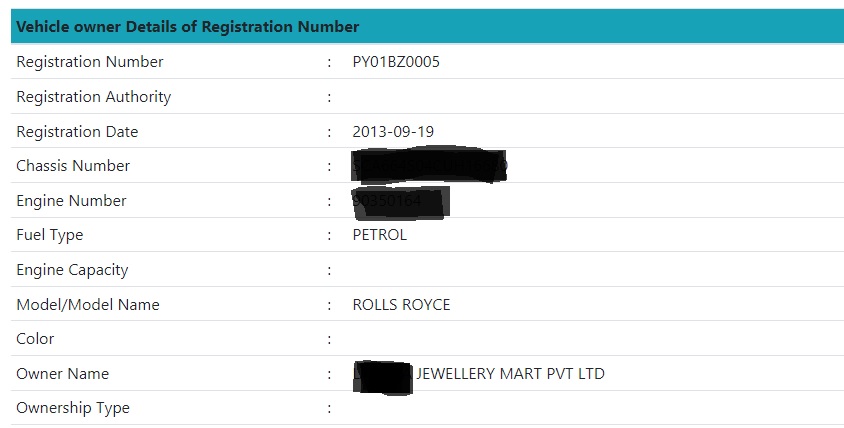 மேலும், அவரது ரோல்ஸ் ராய்ஸ் வாகனப்பதிவு குறித்து அரசு இணையதளத்தில் ஆராய்ந்தபோது, 06/2012 ஆகஸ்ட் அன்றே அவரது கார் பதிவு செய்யப்பட்டுள்ளதும், தமிழ்நாடு பதிவு எண் வழங்கப்பட்டுள்ளதும் நமக்கு உறுதியானது.